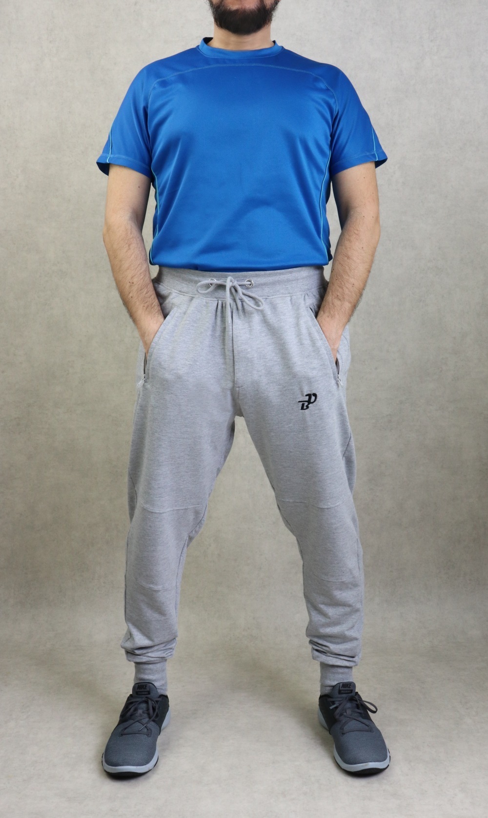 Pantalon gris clair chiné. Tissu épais molletonné très doux. Deux grandes poches zippées latérales et une poche arrière. Braguette zip. Taille élastique avec cordon de serrage. Chevilles élastiques. Brodé logo BU (Best Ummah).