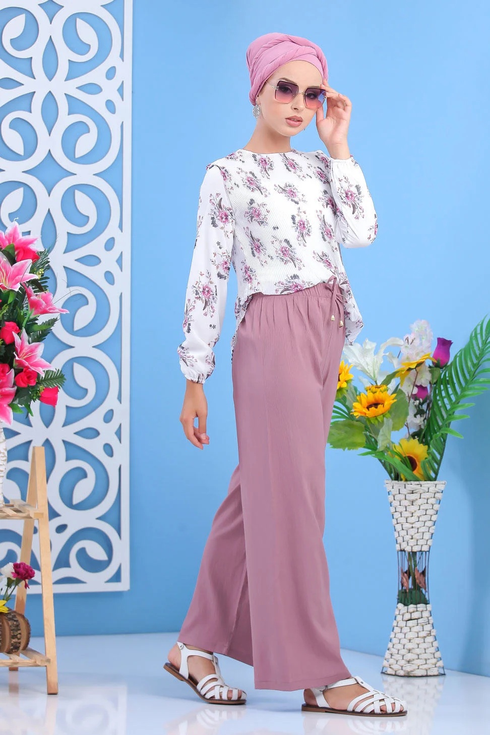 Ensemble Pantalon Palazzo ample et Blouse avec collier assorti (Tenue femme musulmane en ligne) - Couleur crème et kaki - REF. 32871 (19.90 €)