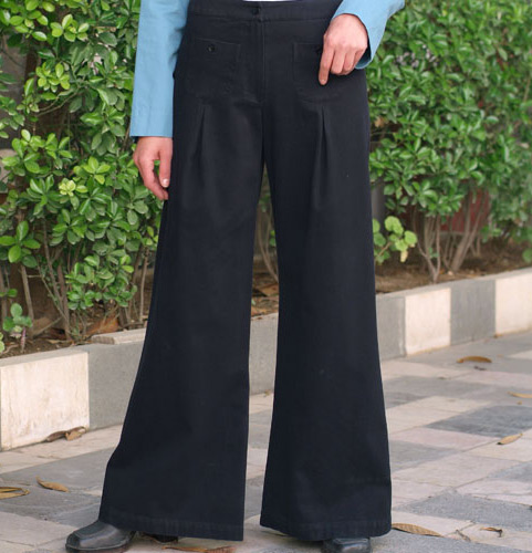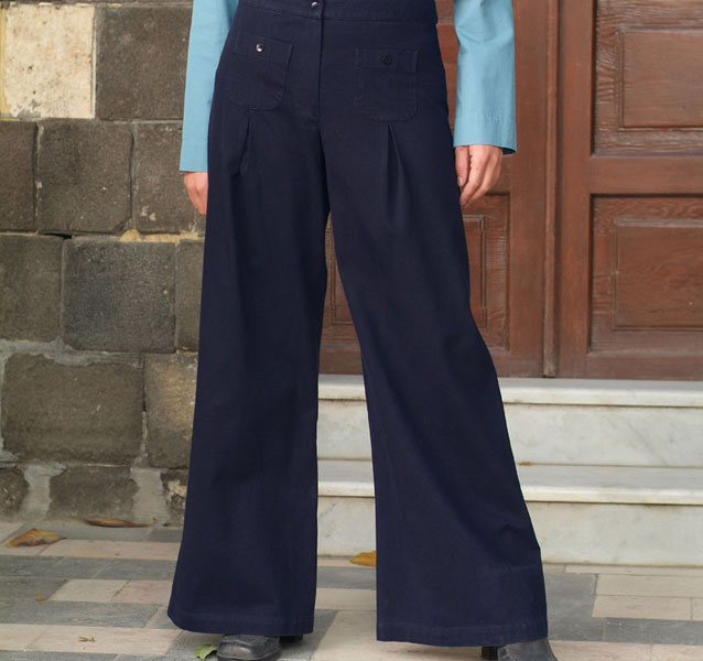 Description: full length; waistband; zip fly and button; 2 front patch pockets with button; released pleat starting from bottom of each pocket; wide leg fit. Imported.