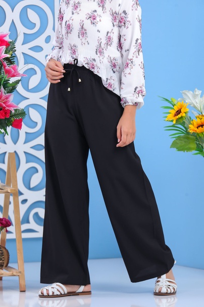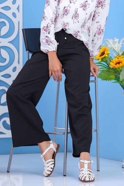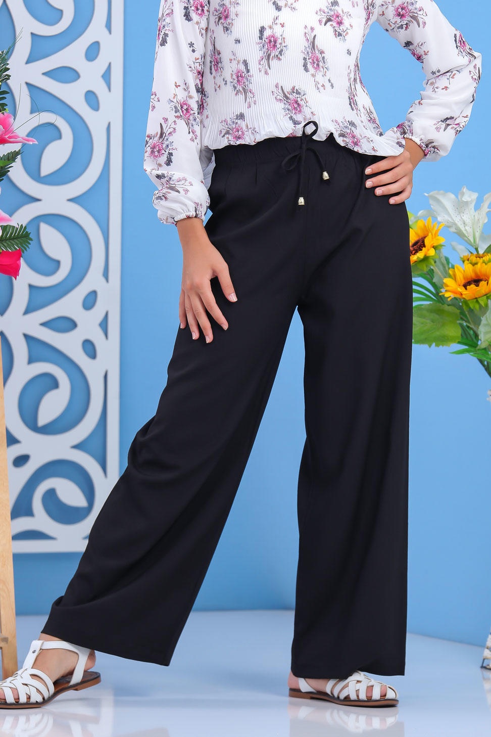 Pantalon long, coupe droite, taille élastique. Ce vêtement élégant est en tissu crêpe et fluide, accommodé d'un lien de serrage, il sera parfait pour la mi saison.