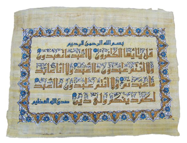 Papyrus fait main par un calligraphe contenant sourate al-Kafiroune (Qoul Yâ Ayyouhal Kâfiroune). Sourate n°109
