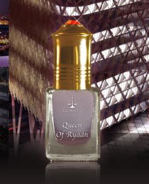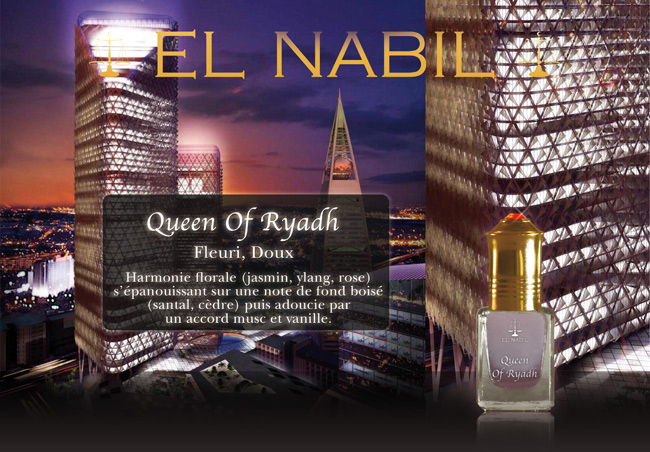 Parfum El Nabil "Queen of Ryadh" : fleuri, doux pour femmes. Harmonie florale (jasmin, ilang, rose) s'épanouissant sur une note de fond boisé (santal, cèdre) puis adoucie par un accord musc et vanille.