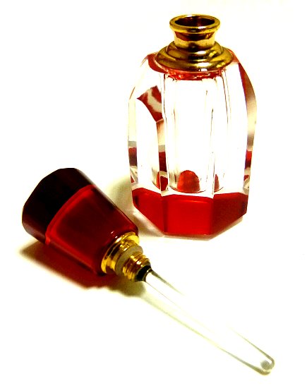 Parfum concentré sans alcool Musc d'Or "Leila" - Pour femmes. Jolie bouteille en cristal avec bouchon tige et fond rouges.