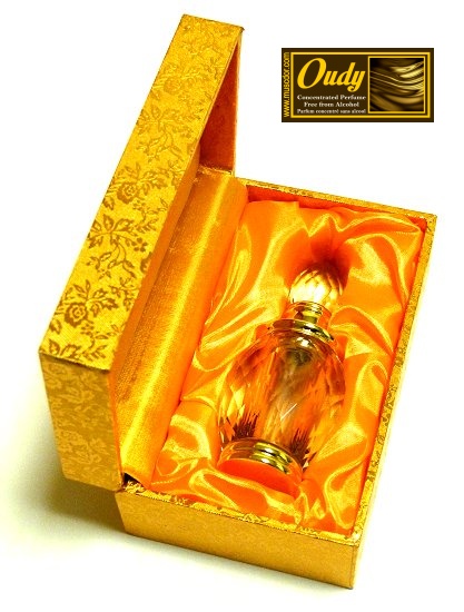 Parfum oriental à base de oud de la marque Musc d'Or dans un très joli flacon en cristal avec applicateur à tige. Partie centrales métallique dorée dans un très beau coffret doré.