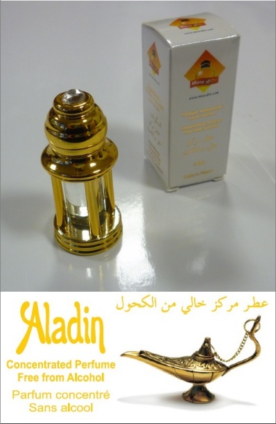 Parfum concentré sans alcool "Aladin" dans un très beau flacon doré avec 4 colonnes. Le bouchon est orné d'un diamant. Parfum mixte (hommes et femmes).