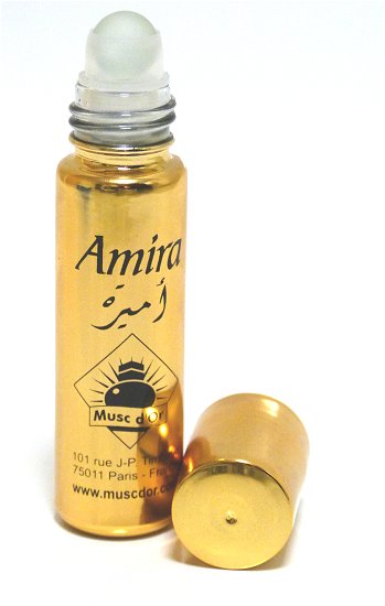 Parfum concentré sans alcool Musc d'Or "Amira" (8 ml). Le mot arabe Amîra (أميرة) signifie princesse. Bouteille dorée de luxe.