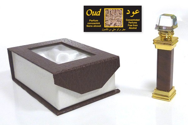 Parfum Oud (عود) concentré dans un jolie flacon marron carré, embase et haut dorés, bouchon pyramidal en cristal avec tige en verre de 55 mm.