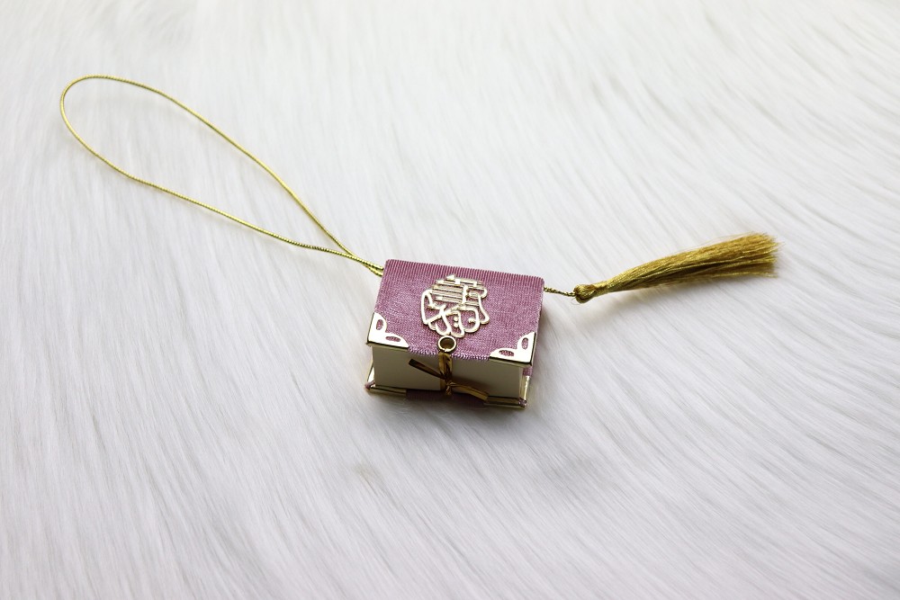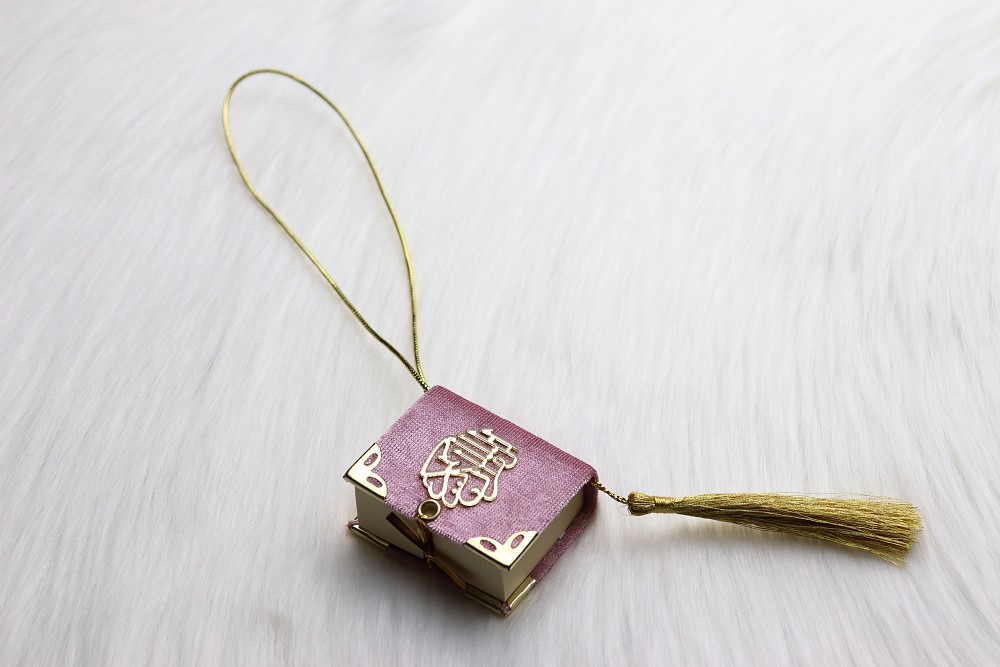 Pendentif Mini-Coran recouvert de velours avec parties dorees (Decoration islam) - Couleur rose