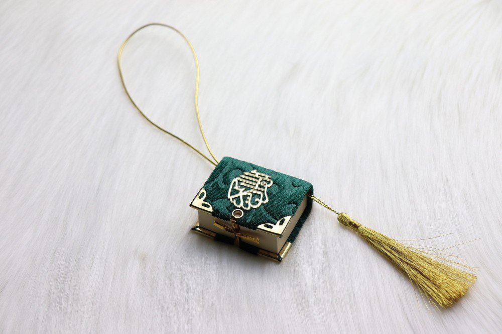 Pendentif Mini-Coran recouvert de velours vert avec partie doree - Decoration Islam
