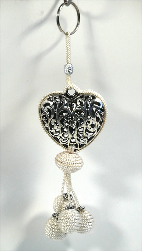 Pendentif / Porte-clés artisanal coeur en métal argenté ciselé et pompon en sabra - Blanc - REF. 29098 (6.90 €)
