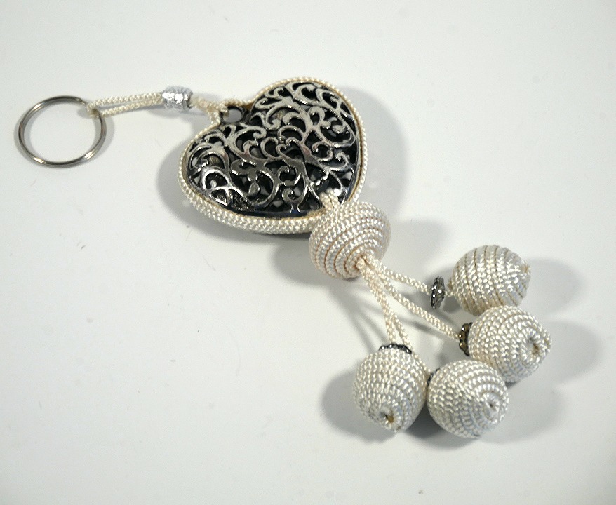 Porte-clés artisanal coeur en métal argenté ciselé et pompon en sabra - Blanc - REF. 29019 (5.90 €)