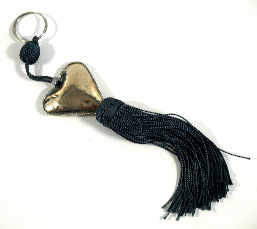 Porte-clés artisanal coeur en métal argenté ciselé et pompon en sabra - Gris - REF. 29010 (5.90 €)