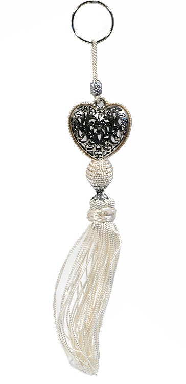 Porte-clés artisanal coeur en métal argenté ciselé et pompon en sabra - Blanc - REF. 29019 (5.90 €)