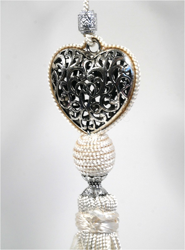 Pendentif décoratif / Porte-clés artisanal coeur en métal argenté ciselé et pompon en sabra - Blanc - REF. 29043 (6.90 €)