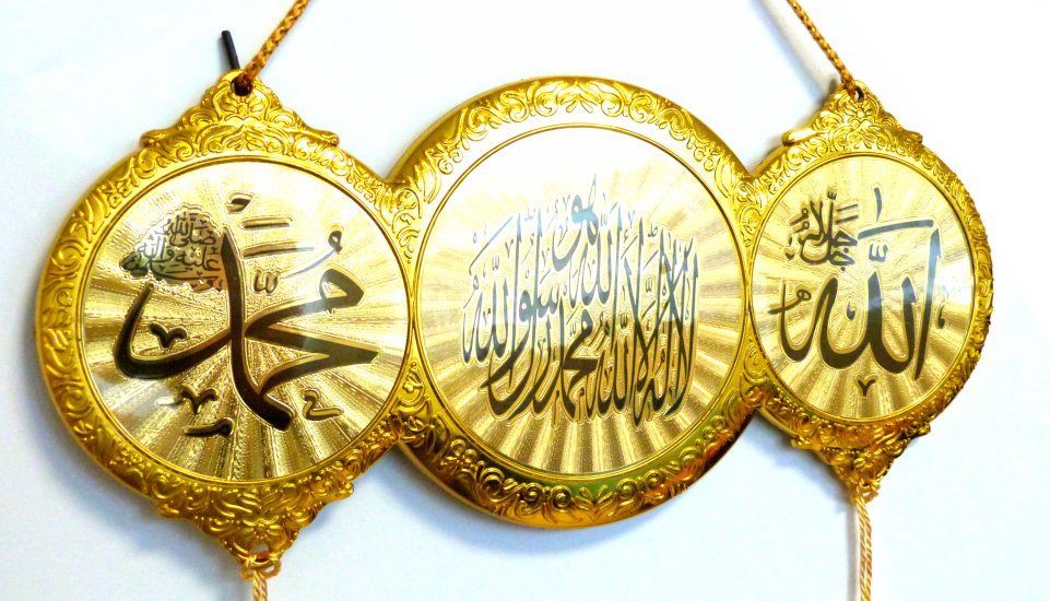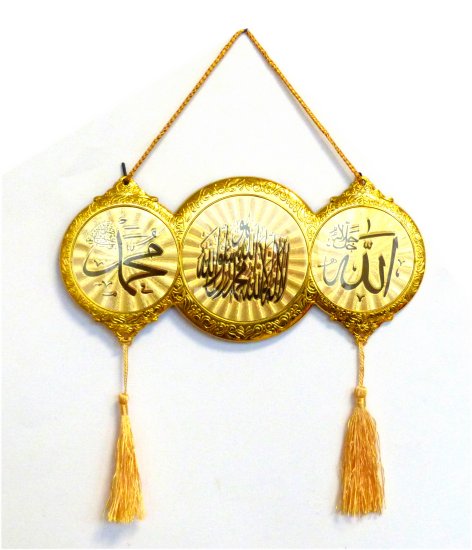 Pendentif doré de décoration avec l'Attestation de foi, Le nom d'ALLAH et le Nom de prophète Mohammed (Saw).