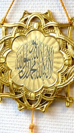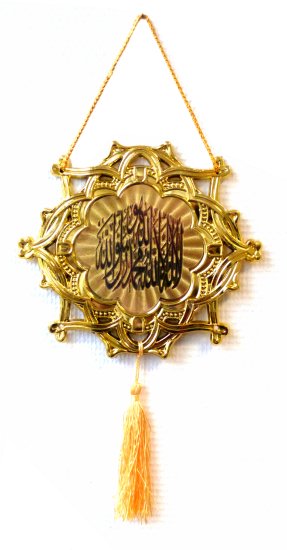 Pendentif islamique décoratif doré avec La Shahada شَهَادَة (ou chahada) la profession de foi.
