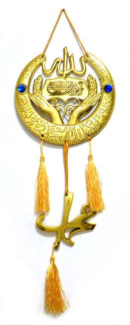 Pendentif (fanion) décoratif doré avec le nom d'Allâh et sourate Al Falaq (سورة الفلق) inscrite dans la forme d'un livre, et l'attestation de foi (chahada) inscrite dans un croissant de lune, avec la forme de mains faisant des dou'â' par en dessous.
