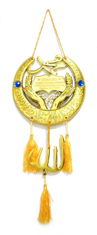 Pendentif (fanion) islamique décoratif doré le verset du Trône (آية الكرسي) inscrite dans la forme d'un livre, le nom du prophète Muhammad (saw) et l'attestation de foi (chahada) inscrite dans un croissant de lune, avec la forme de mains faisant des dou'â' par en dessous.