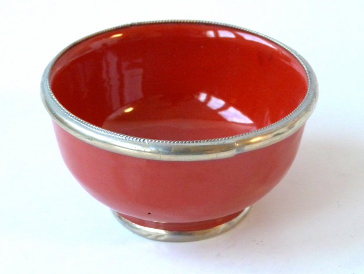Joli récipient Rouge, de taille petite, en poterie, de provenance de Marrakech (Maroc), émaillé et cerclé de métal ornemental argenté légèrement ciselé.