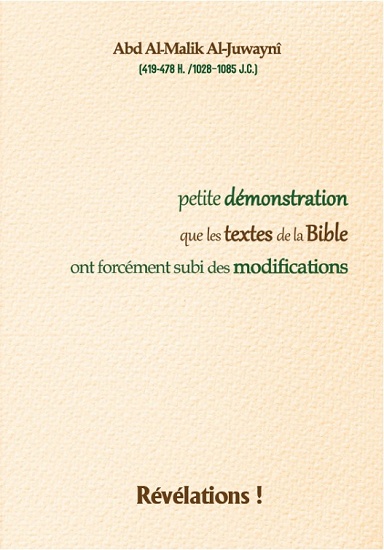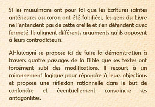 A travers quatre passages de la Bible, l'imam Al Juwayni tente de démontrer les modifications qu'a subi la Bible.