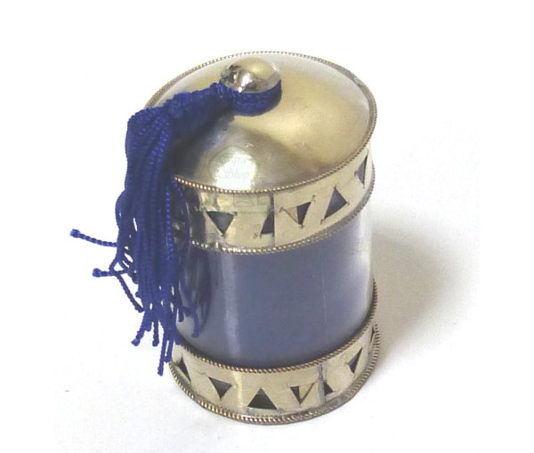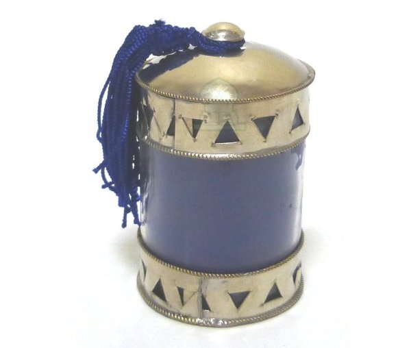 Photophore / Bougeoir en verre avec bougie cerclee de metal argente cisele termine d'un pompon en Sabra - Modele bleu