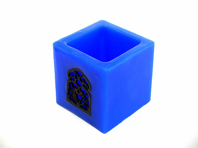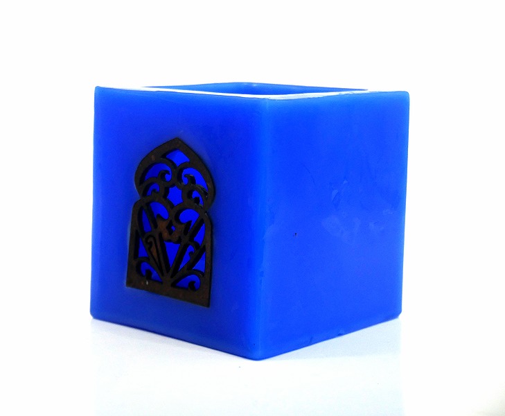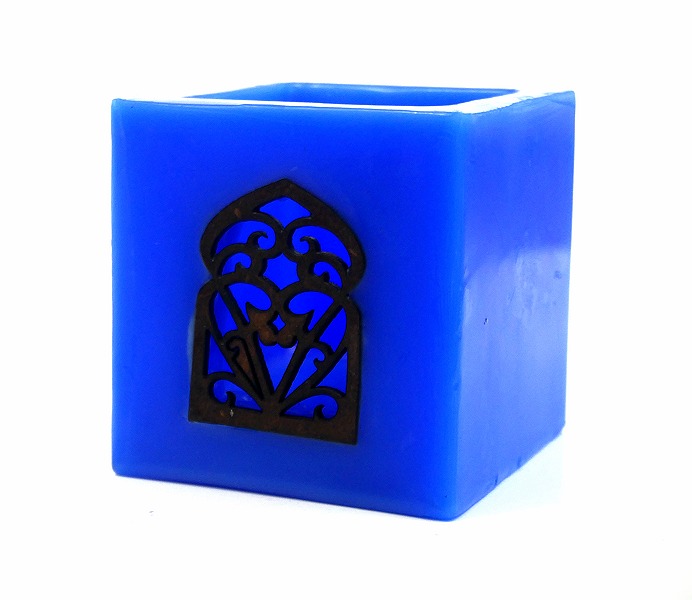 Petit photophore décoratif, provenant de Marrakech (Maroc), peint en bleu, émaillé, jolies ciselures en forme d'étoile, de croissant lunaire...