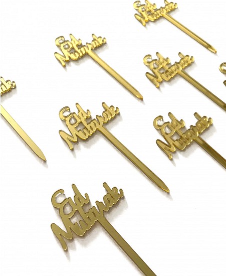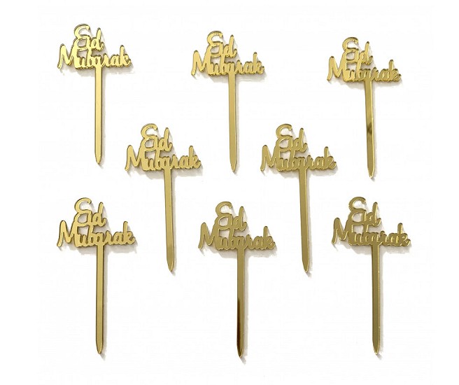 Chaque pique à gâteau fait 8 x 4 cm il est en plastique doré avec écriture "Eid Mubarak".