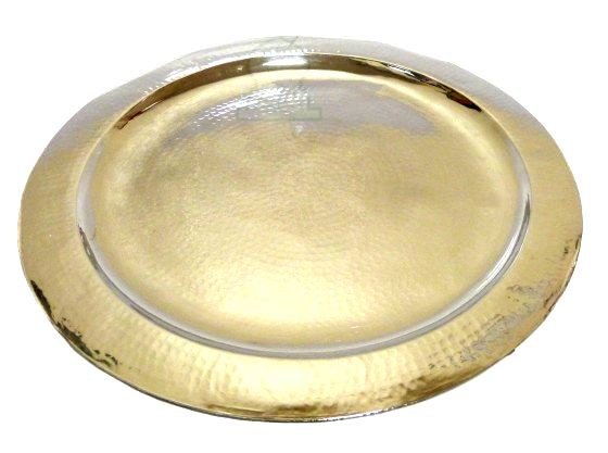 Plateau artisanal marocain, de forme ronde, de taille moyenne (35cm de diamètre), fabriqué en métal argenté, minutieusement cerclé, et délicatement martelé.