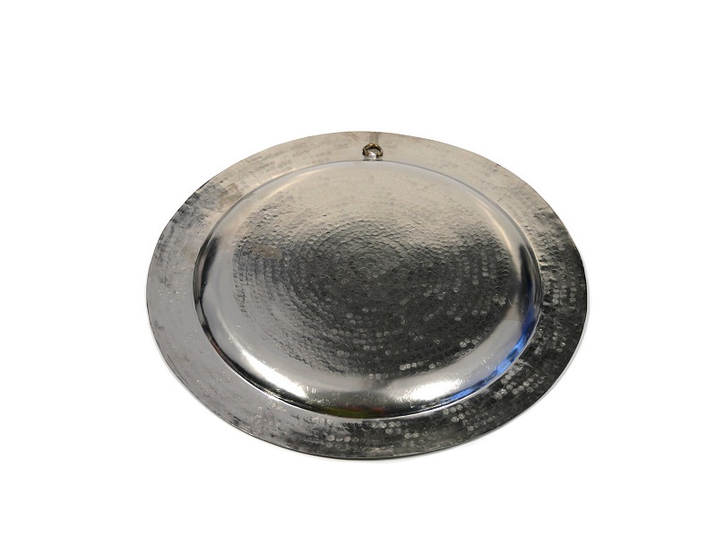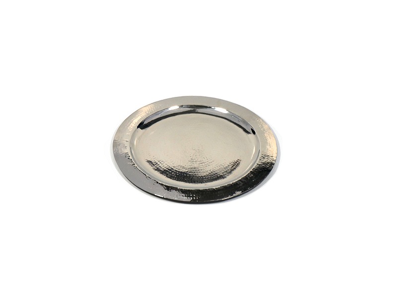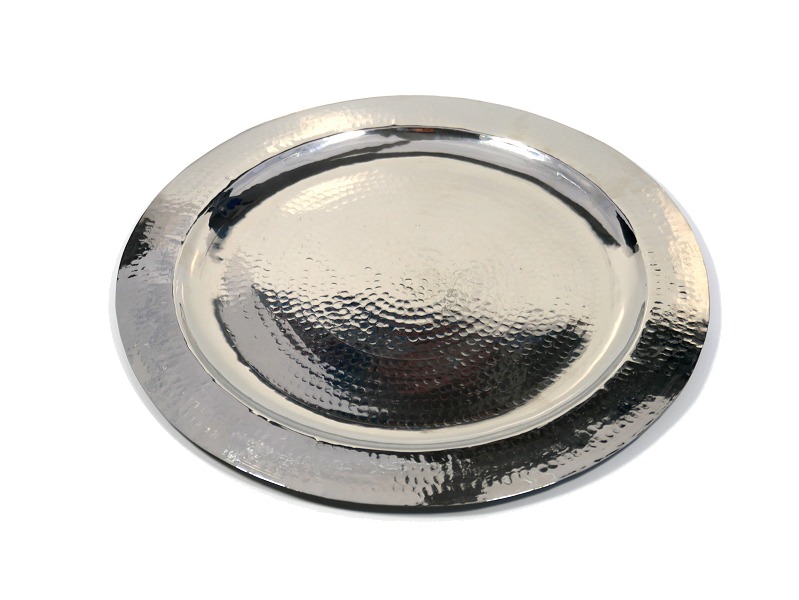 Plateau artisanal marocain, de forme ronde, de grande taille (30cm de diamètre), fabriqué en métal argenté, minutieusement cerclé, et délicatement martelé.