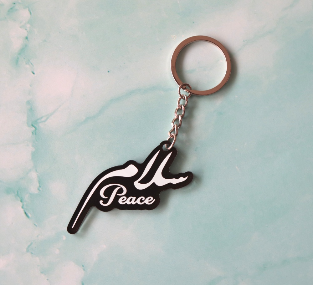 Porte clé avec la calligraphie du mot "Paix" en arabe (Salâm سلام) et en anglais (Peace).