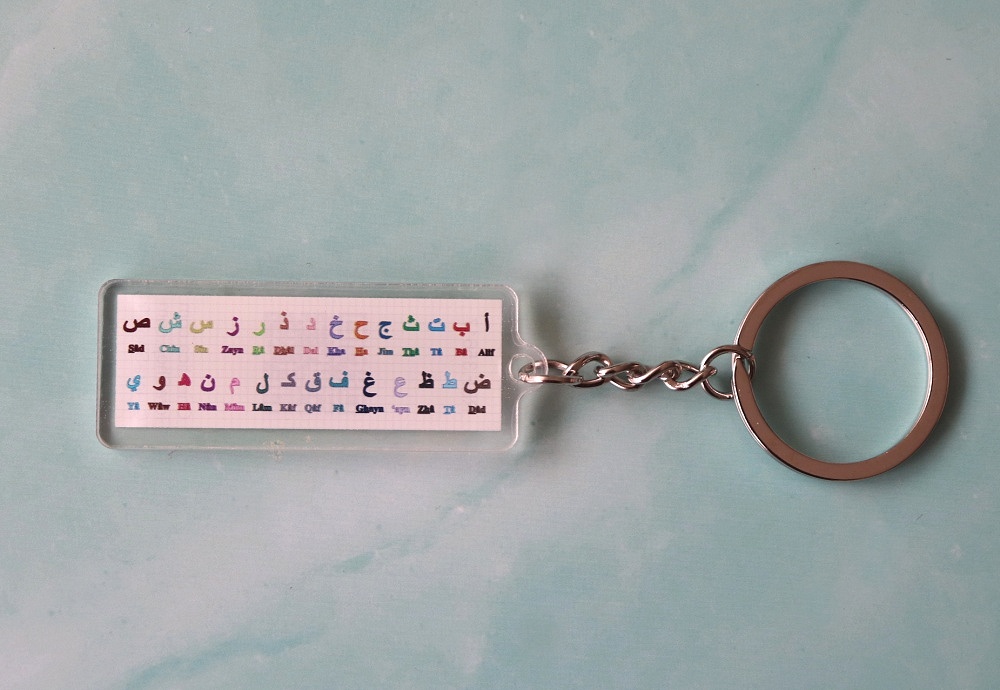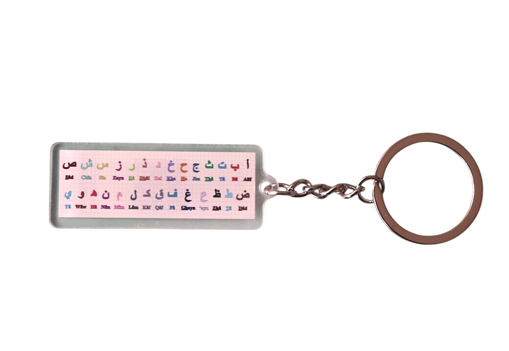 Porte clé avec les 28 lettres de l'alphabet arabe écrits en arabe et en phonétique.