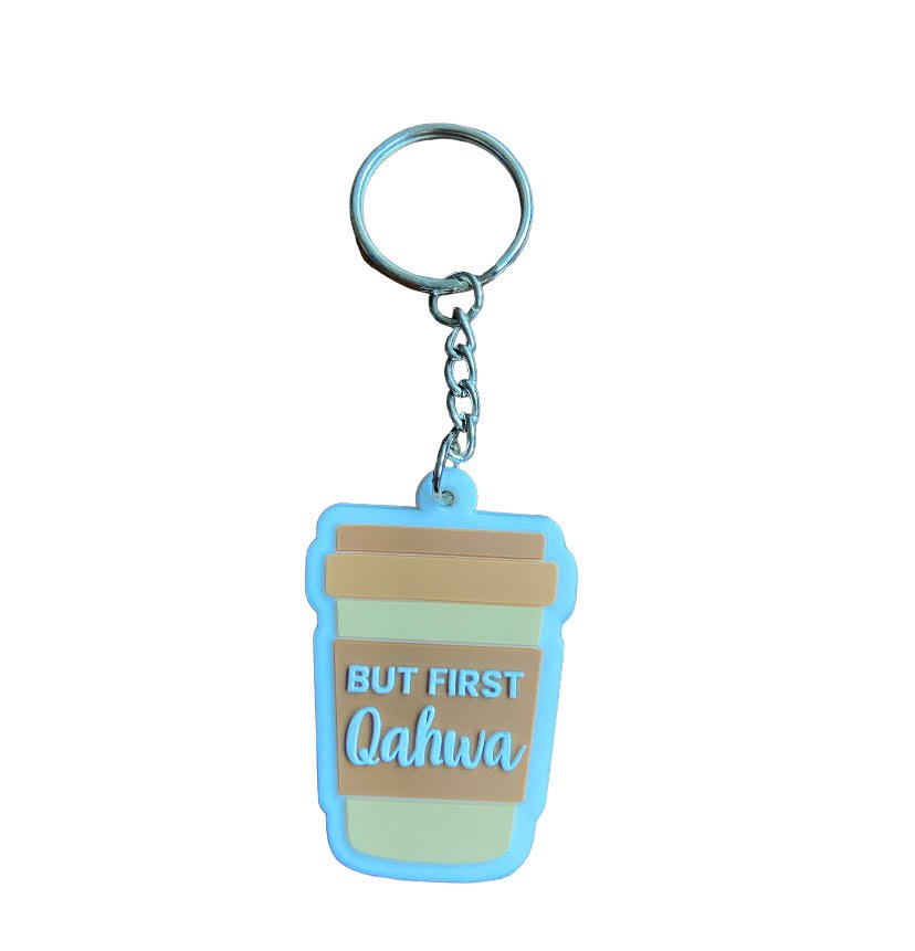 Porte-clé plastique souple "But first Qahwa" (Mais d'abord un café)