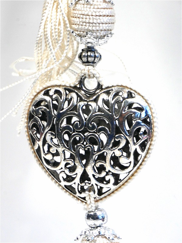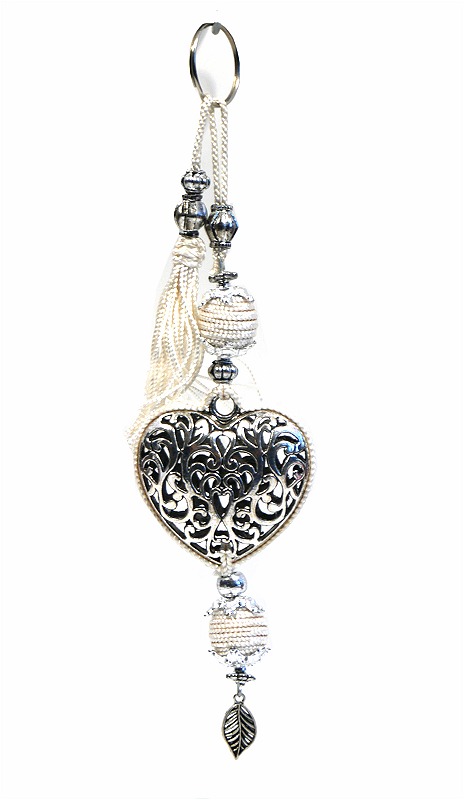 Pendentif décoratif / Porte-clés artisanal coeur en métal argenté ciselé et pompon en sabra - Blanc - REF. 29043 (6.90 €)