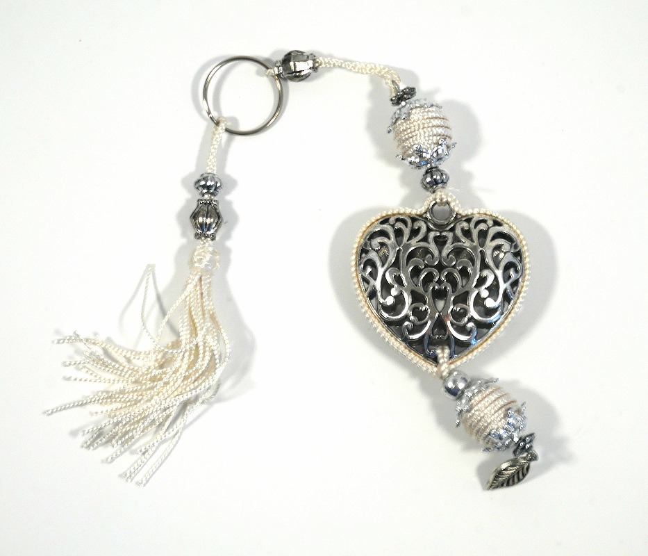 Porte-clés artisanal coeur en métal argenté ciselé et pompon en sabra - Blanc Deco & Cadeau