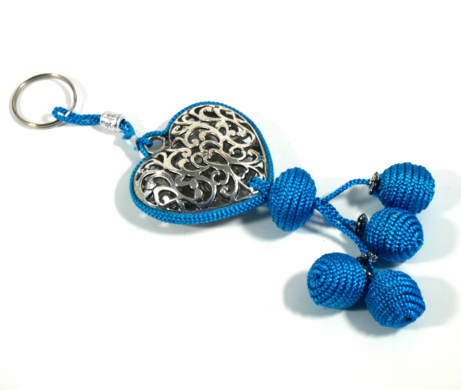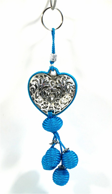 Porte-clés en métal argenté joliment ciselé, constitués de breloques, grand coeur, et de pompon en sabra, avec 8 coloris disponibles... De jolis agréments argentés font de ces porte-clés des pièces originales.