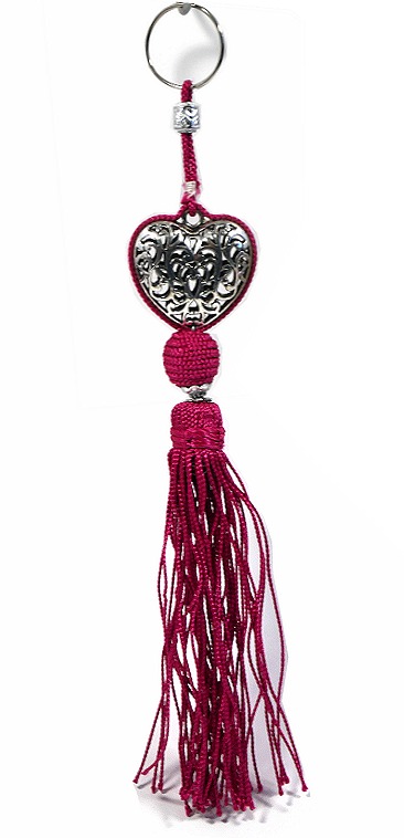 Porte-clés artisanal coeur en métal argenté ciselé et pompon en sabra - Fushia - REF. 29018 (5.90 €)