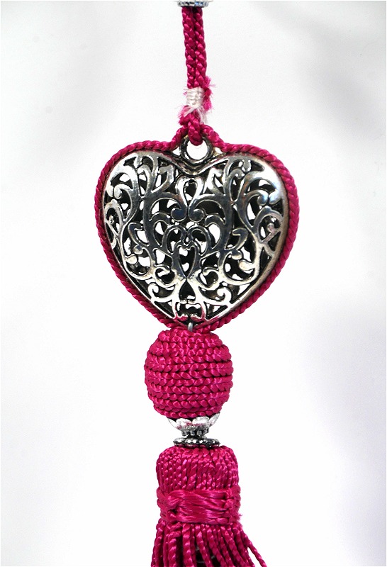 Porte-clés artisanal coeur en métal argenté ciselé et pompon en sabra - Fushia - REF. 29149 (4.90 €)