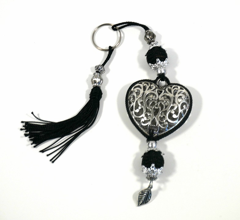 Porte-clés artisanal coeur en métal argenté ciselé et pompon en sabra - Noir - REF. 29006 (5.90 €)
