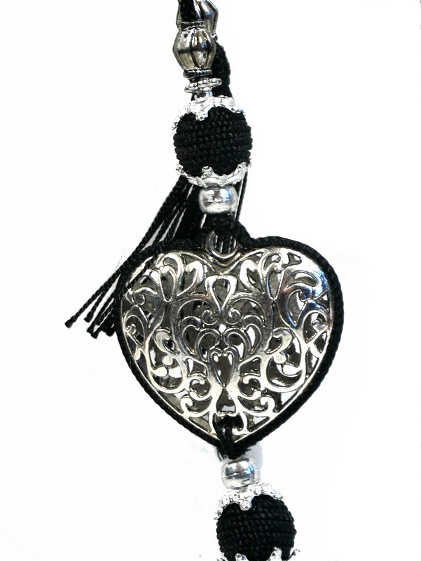 Pendentif / Porte-clés artisanal coeur en métal argenté ciselé et pompon en sabra - Noir - REF. 29099 (6.90 €)