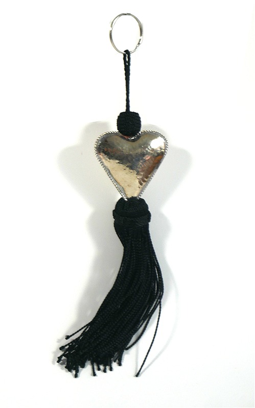 Pendentif / Porte-clés artisanal coeur en métal argenté ciselé et pompon en sabra - Noir - REF. 29099 (6.90 €)