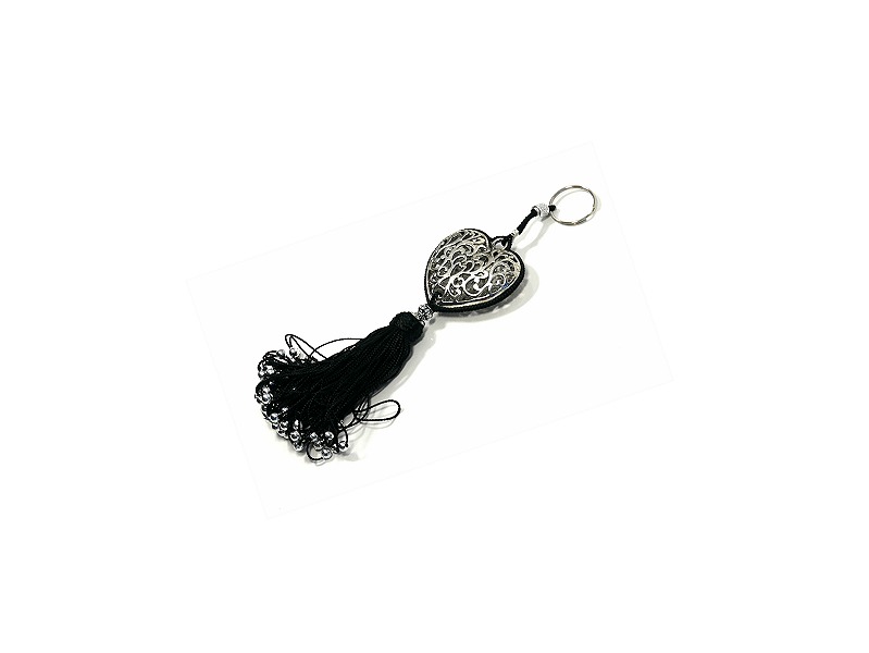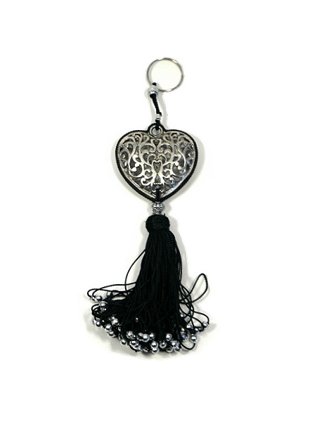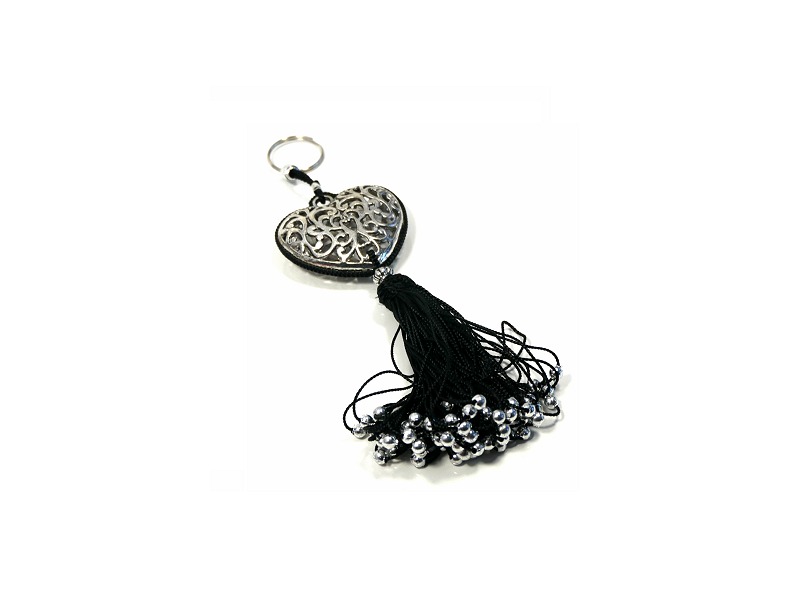 Porte-clés artisanal coeur en métal argenté ciselé et pompon en sabra - Noir - REF. 29006 (5.90 €)