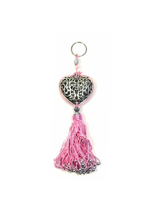 Porte-clés artisanal coeur en métal argenté ciselé et pompon en sabra - Rose clair - REF. 29156 (4.90 €)