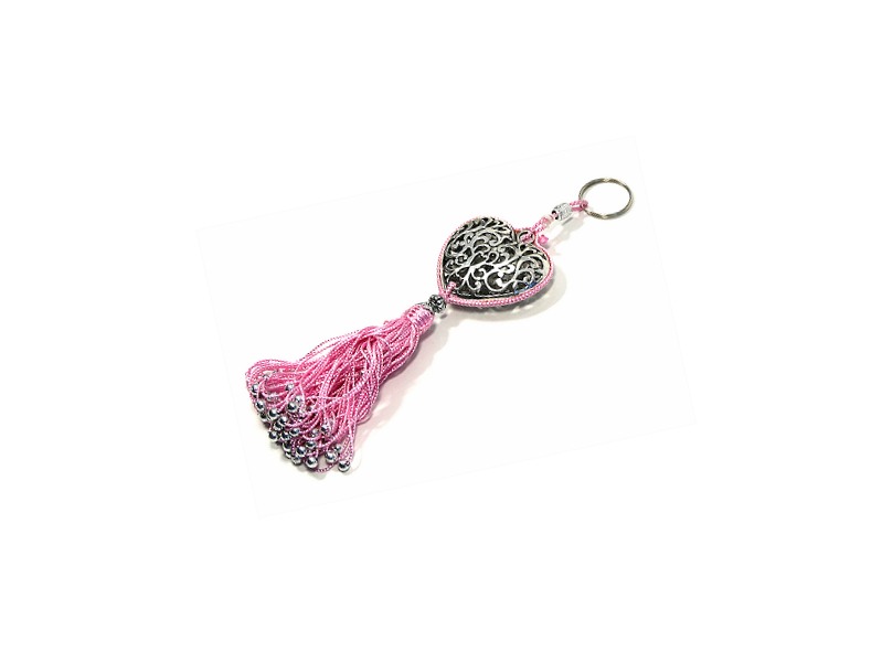 Pendentif / Porte-clés artisanal coeur en métal argenté ciselé et pompon en sabra - Rose clair - REF. 29046 (6.90 €)