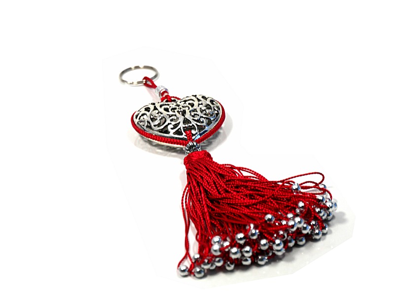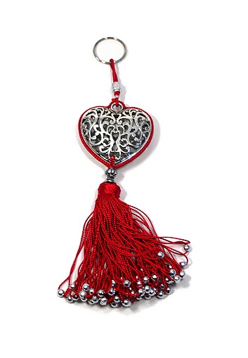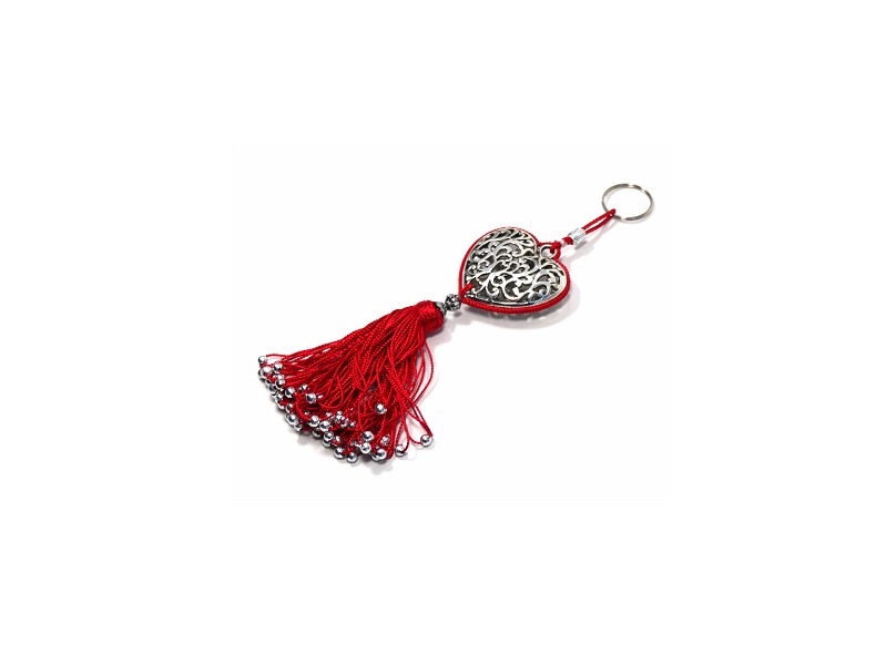 Porte-clés artisanal coeur en métal argenté ciselé et pompon en sabra - Rouge - REF. 29101 (6.90 €)