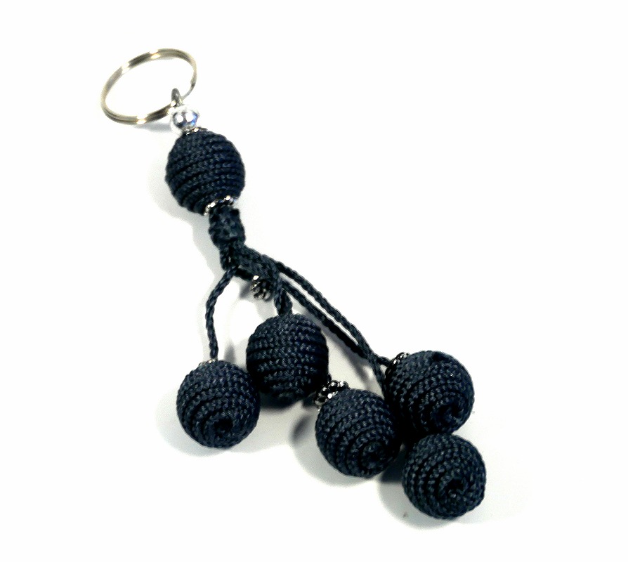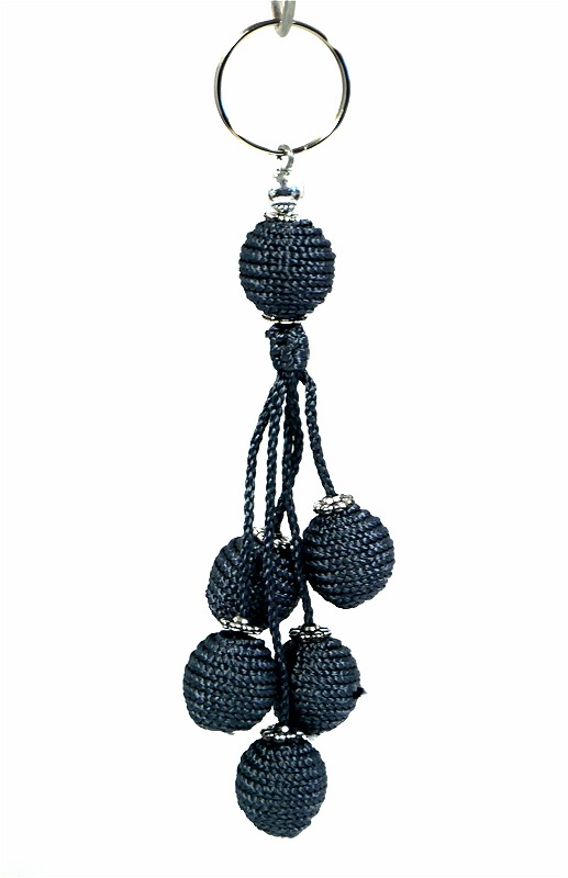 Porte-clés tout en sobriété, fait à la main par un artisan. Il arbore des pompons et une couleur gris argent.