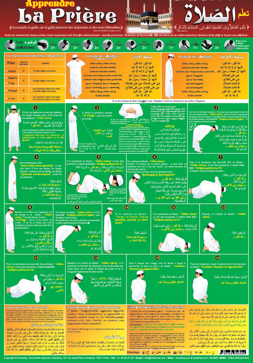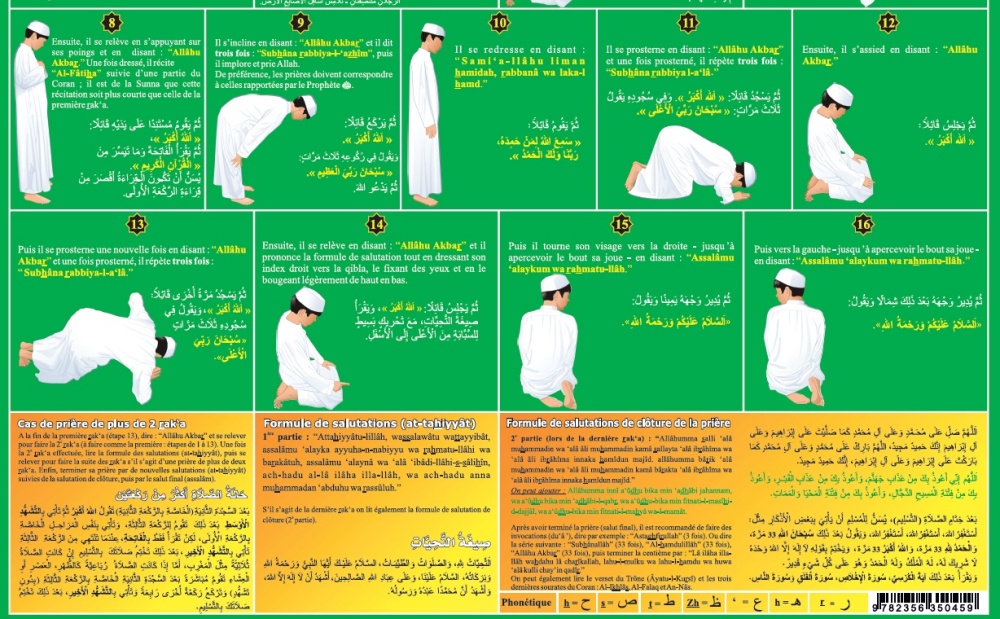 Poster très complet sur l'apprentissage de la prière adapté aux hommes / garçons. La formule d'al-adhân y est détaillée, ainsi que d'al-iqâma, le tachahhûd final, al-salât al-ibrahimiyya, les invocations après la prière...