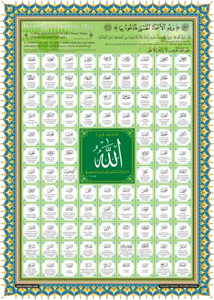 Rapporté par Bukhârî et Muslim par le biais d'Abû Hurayra. Il est à noter que plusieurs hadiths ont cités les Noms de Dieu, la liste exposée dans le poster n’implique pas qu’il n’y a pas d’autres Beaux Noms de Dieu.