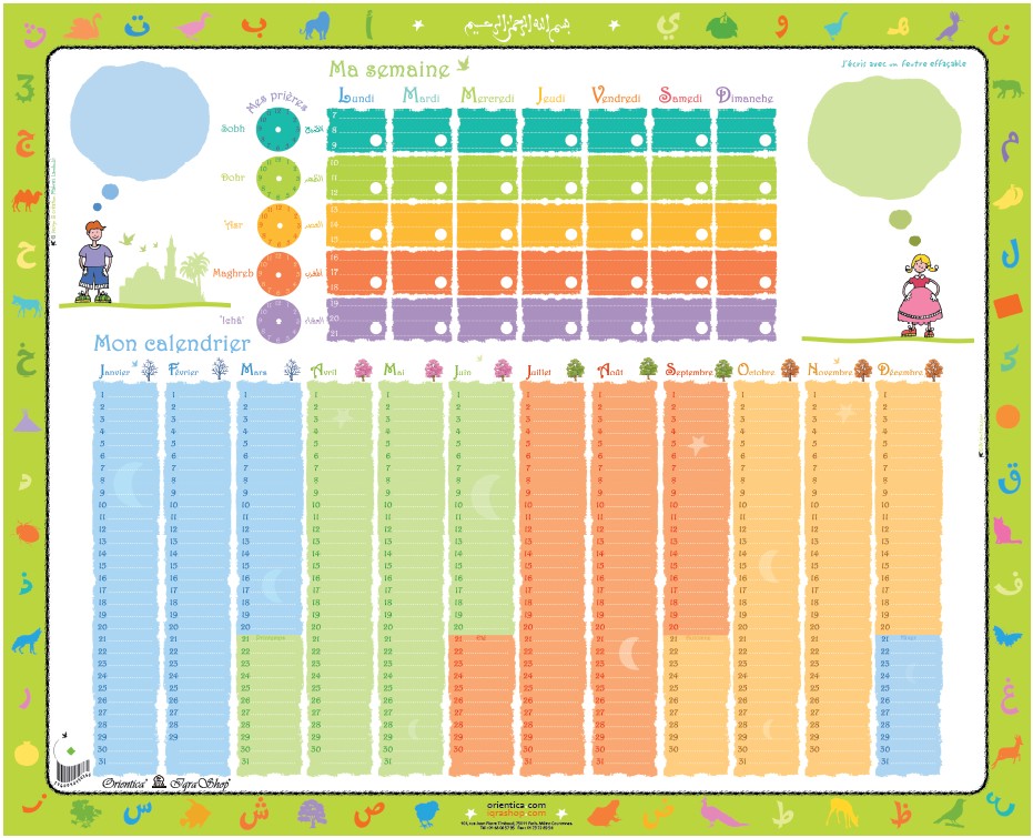 Poster "Mon calendrier permanent effaçable", utilisable pour tout le temps car ne se périme pas d'une année à l'autre... A utiliser avec un feutre effaçable (non fourni). On peut y noter son agenda, dessiner les aiguilles des montres pour indiquer les heures des 5 prières quotidiennes. Sur le pourtour les 28 lettres de l'alphabet arabe. Fourni avec un feutre effaçable.