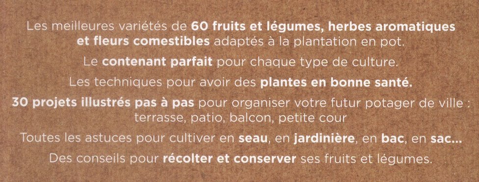 Comment transformer le plus petit lopin de terre en potager ? C'est ce qu'apprend ce livre à travers 30 projets pas à pas, richement illustrés. Une première partie présente les outils et les techniques spécialement adaptés à de petits espaces, et en particulier les méthodes de culture en pots. Puis on trouve : des explications pour chaque fruit, légume ou herbe aromatique qui peut pousser en pot ; quel pot choisir pour quelle culture et quelle variété ; les astuces pour avoir des plantations riches en goût et belles à voir ; des styles pour tous les types de petits jardins, balcons, terrasses, patios ; les techniques clé pour les bacs, les paniers suspendus, les sacs, les pots ; les incontournables pour prendre soin de ses plantations et régler les problèmes s'il en survient.