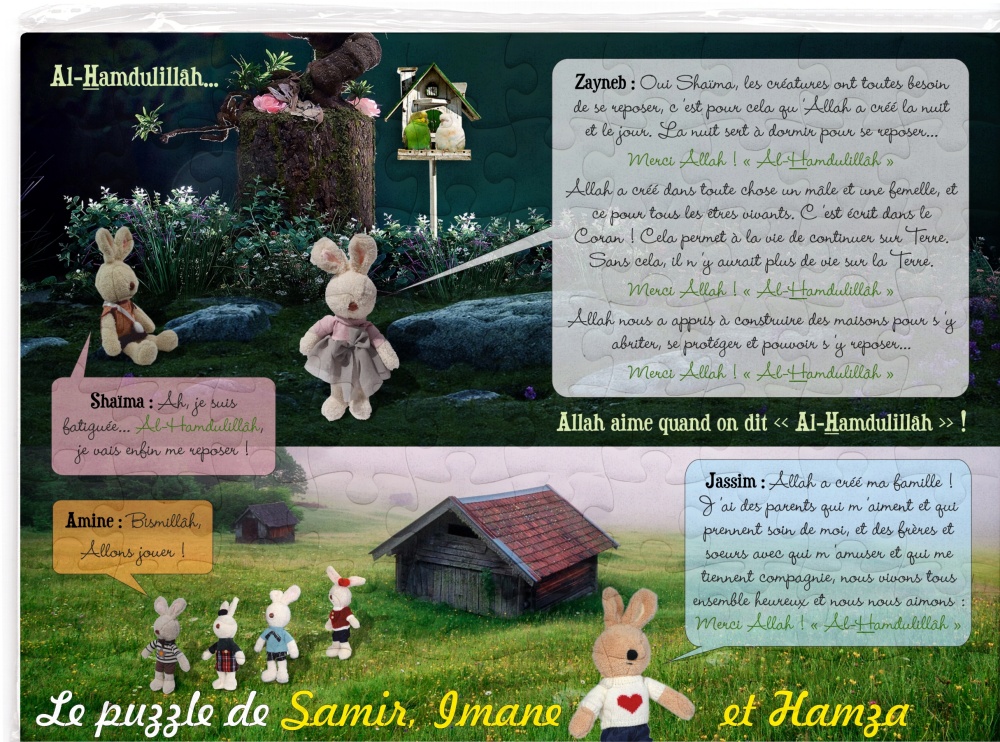 Dans ce puzzle personnalisable, l'enfant va apprendre à dire Bismillah, la signification d'Al-Hamdulillâh et les dialogues vont l'aider à découvrir certains signes d'Allah dans Sa Création...